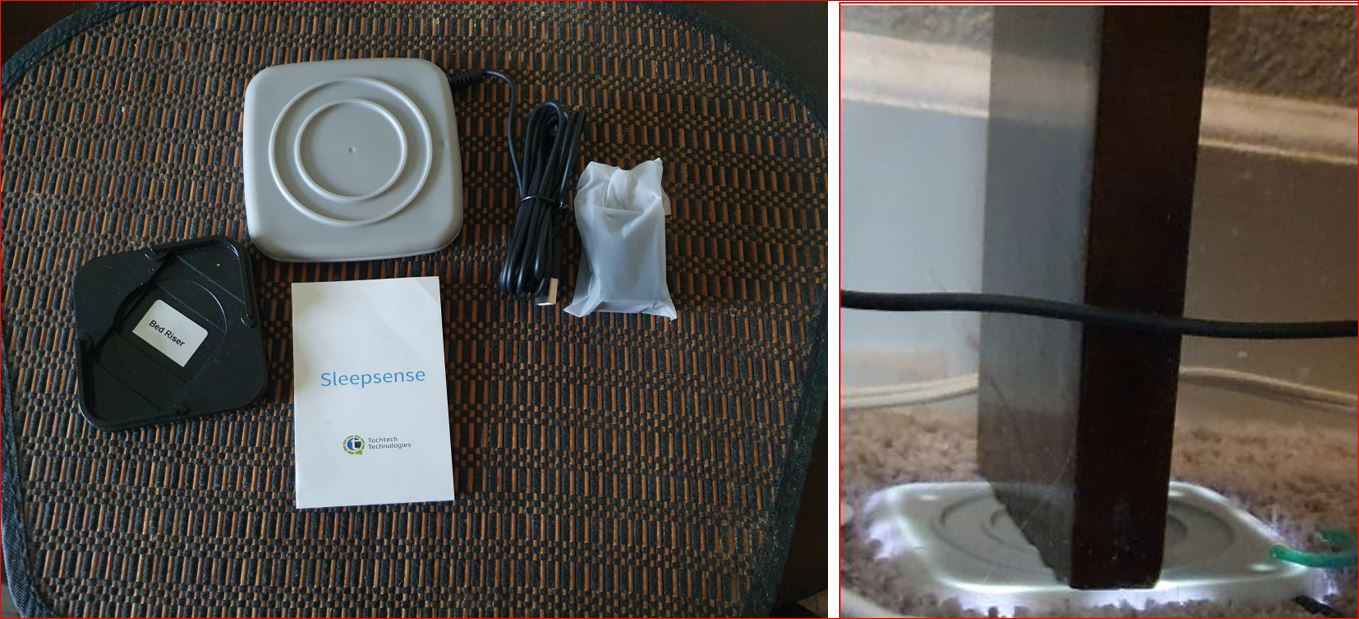 Caption: L. Tochtech Sleepsense after unpacking. R: Under the leg of the bed.