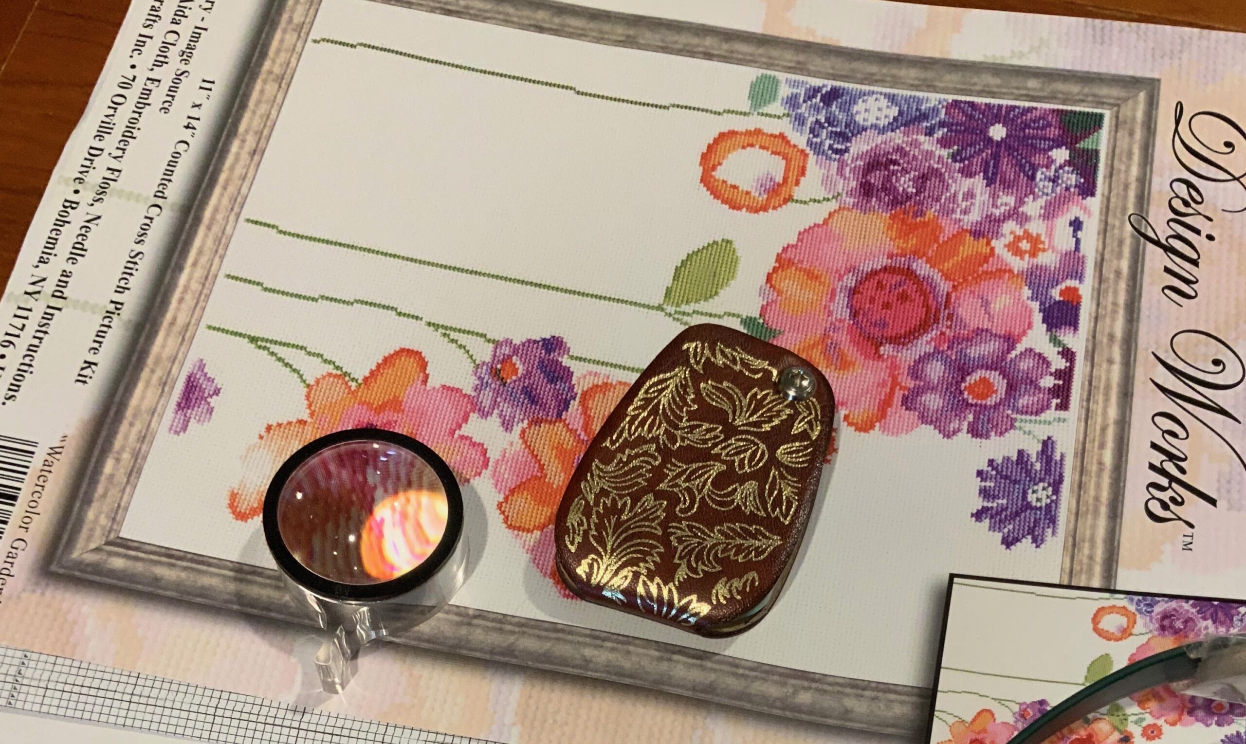 Caption: Basic Magnifier with the cross stitch Explorer Rosalie uses it for.